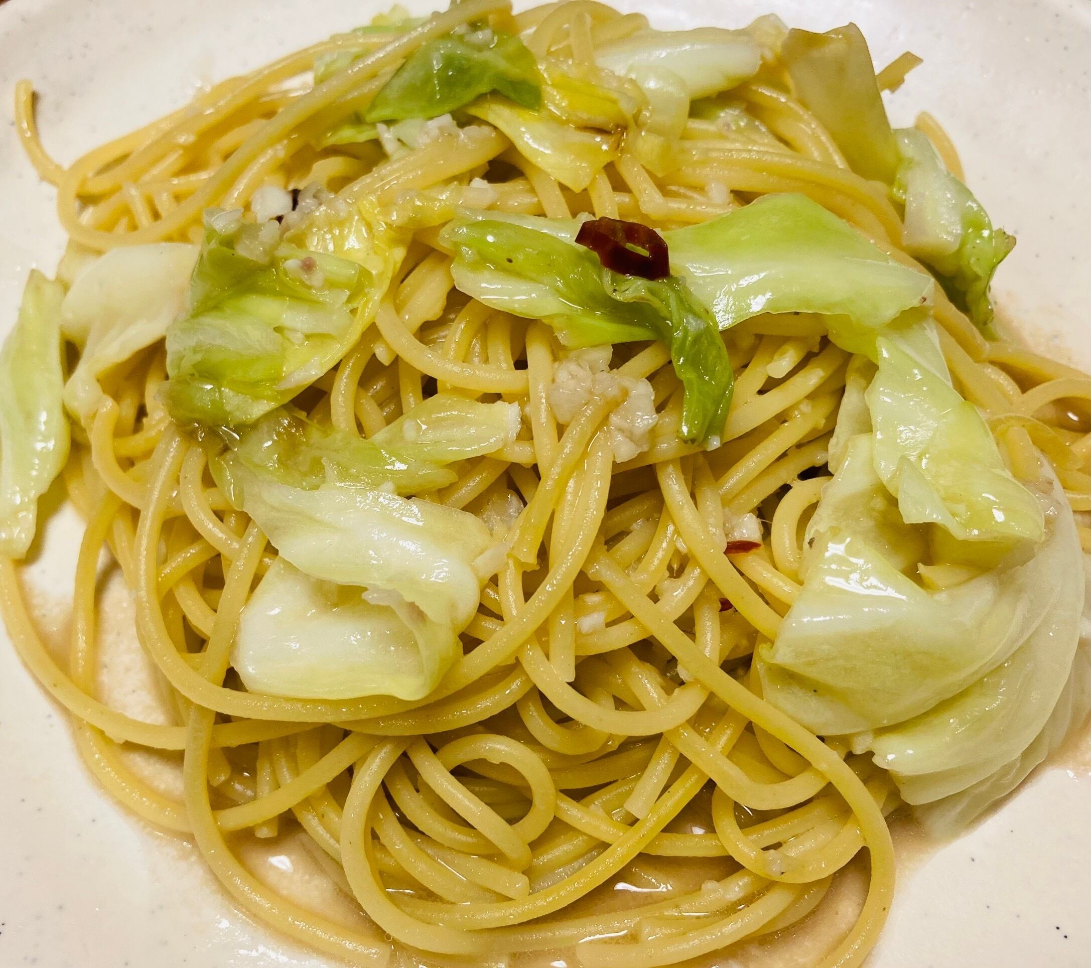 スパゲティ(イタリア産)、キャベツ、アンチョビ、ニンニク、オリーブオイル、塩、タカノツメ